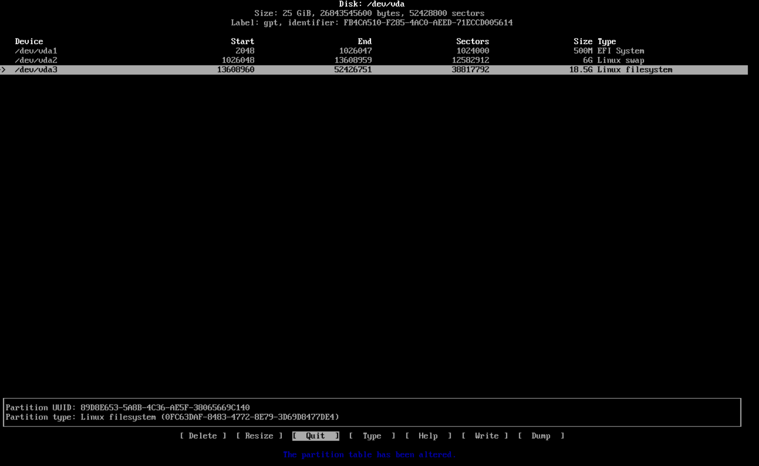 Gdy już wiemy jak nazywa się nasz dysk to musimy go sformatować i stworzyć odpowiednie partycje. Wpisujemy "cfdisk /dev/vda" i odpala się program cfdisk. Jeżeli mamy jakiekolwiek partycje na dysku to musimy je usunąć.