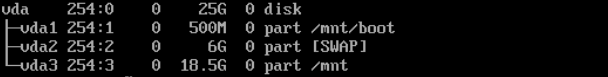 Ostatnie co robimy w kwestii przygotowania dysku to odpalamy partycję "SWAP", służy do tego polecenie "swapon /dev/vda2".