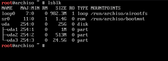 Następnie należy zrobić partycje na dysku, ale najpierw musimy wiedzieć jak nazywa się nasz dysk. Wpisujemy w terminal "lsblk" i powinno pojawić się takie okno. W naszym przypadku dysk to "vda" pełna nazwa to /dev/vda, u was najprawdopodobniej będzie to "sda" (/dev/sda) lub "nvme0n" (/dev/nvme0n).