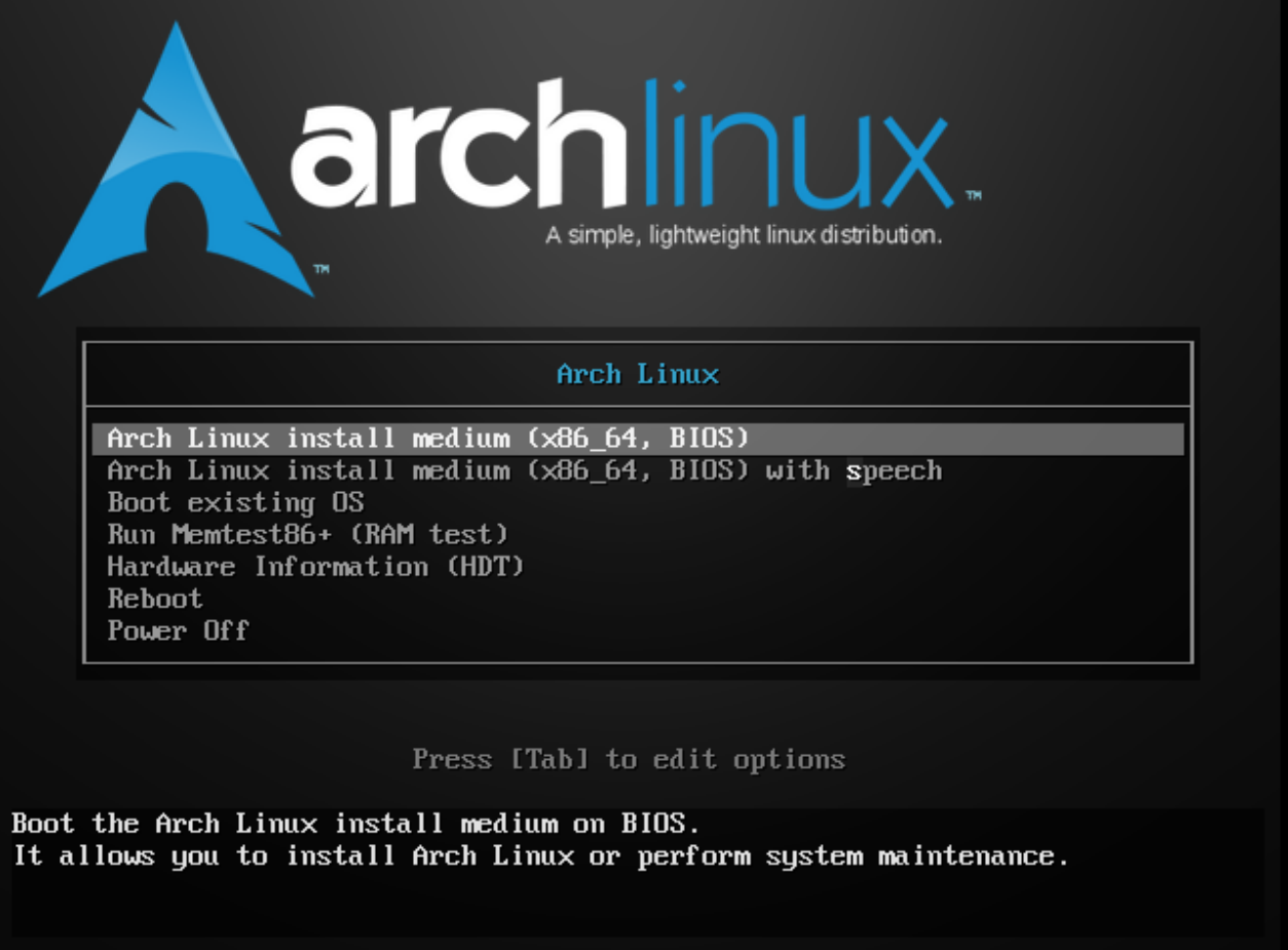 Pierwsze co zobaczymy po odpaleniu komputera z pendrive'a to menu bootloadera. Wybieramy "Arch Linux install medium (x86_64, BIOS) i wciskamy Enter.