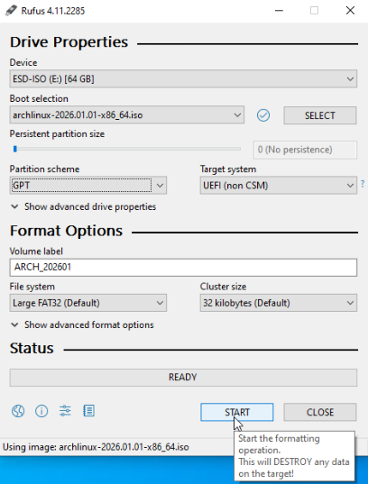 Wypalanie obrazu ISO każdej dystrybucji Linuxa wygląda praktycznie tak samo. Pobieramy obraz systemu (dostępny do pobrania w zasobach), odpalamy program Rufus, wybieramy pendrive'a z listy, następnie wybieramy plik ISO.
